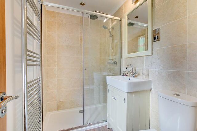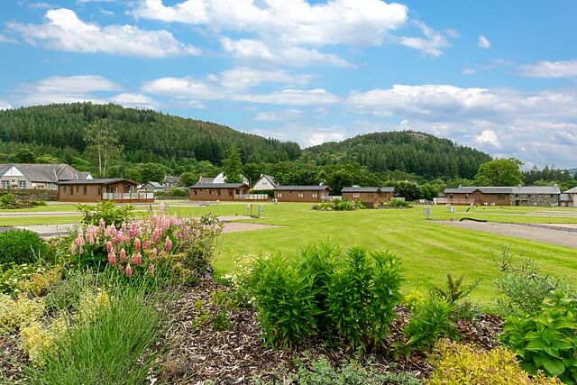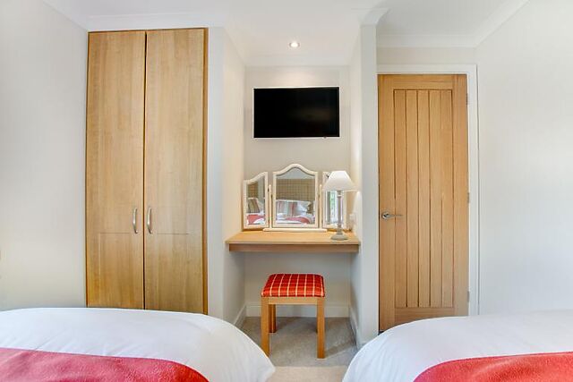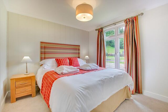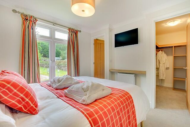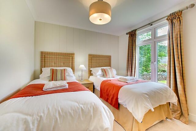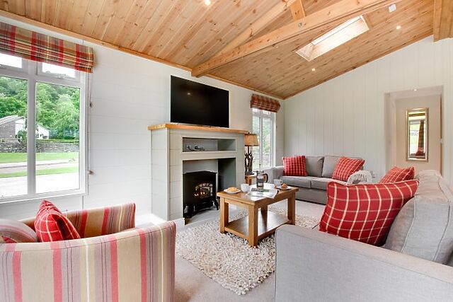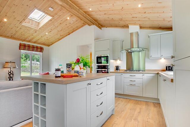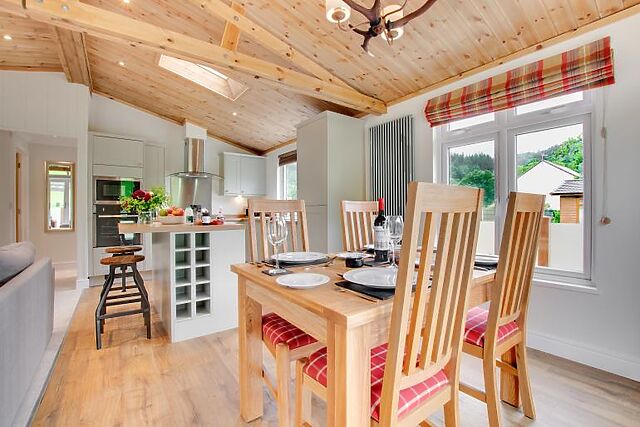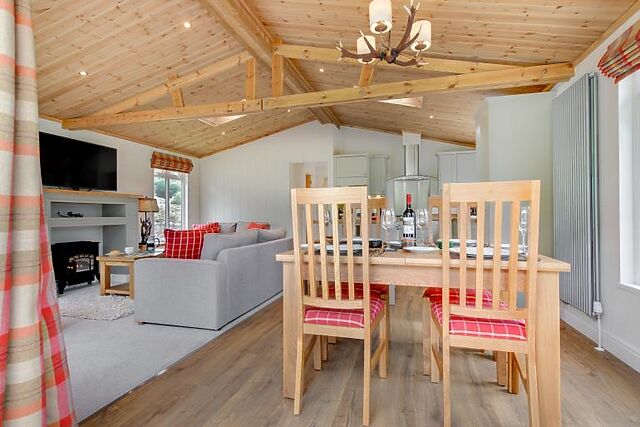 Enjoy your meals at the small breakfast bar or the dining table that seats four. The lodge features a king-size bedroom with an en-suite bathroom and a twin bedroom, both furnished in creamy tones and equipped with Smart TVs.