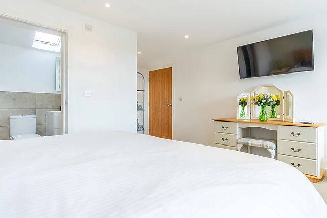 Across the property, four inviting bedrooms offer comfort and flexibility: two king-size rooms with TVs, one with its own en-suite; a twin room also with a TV; and an external double bedroom benefitting from en-suite facilities, perfect for anyone seeking a little extra privacy. A sleek family bathroom with bath and walk-in shower completes the indoor setup.
