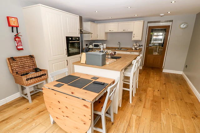 The sitting room has been comfortably furnished, with the wonderful exposed stone chimney breast and fireplace housing a warming woodburner, perfect for those chillier evenings, or setting the scene for enjoying a romantic candlelit meal or an evening in watching your favourite film. The modern, classic cream kitchen is light, bright and very spacious and very well-equipped, right down to the wine cooler!