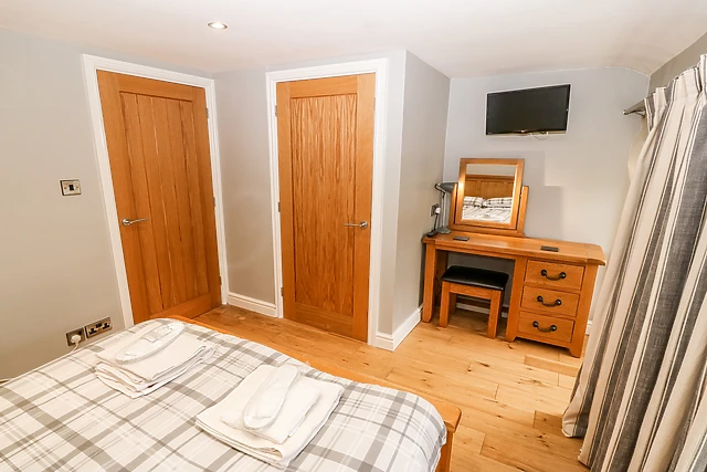 To complete you holiday cottage, upstairs is a beautiful king-size bedroom and a wonderful bathroom with modern units, a double walk-in shower and with your favourite music piped through from downstairs you can enjoy a little bit of pampering and a long hot soak in the double-ended bath, just what you need after a day out and about exploring. Outside, off the kitchen, is an enclosed, rear patio with picnic table and benches, so why not enjoy a refreshing cold drink on a warm summer’s day or evening?