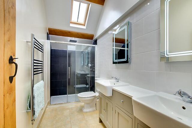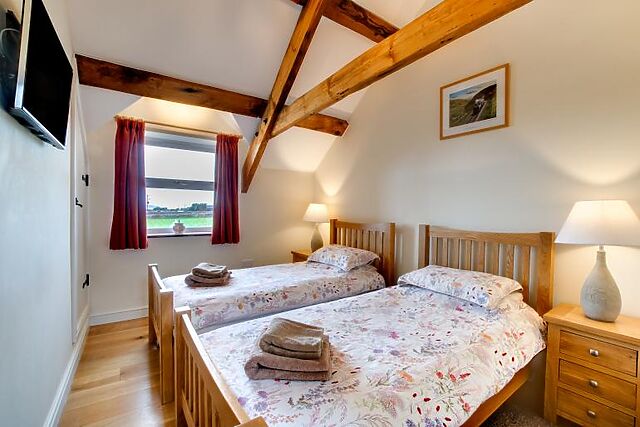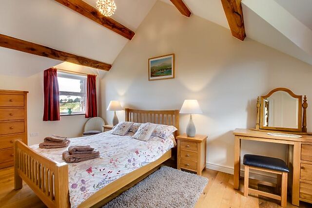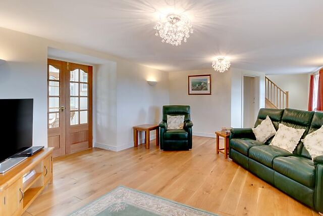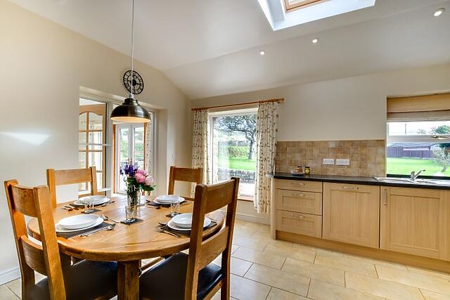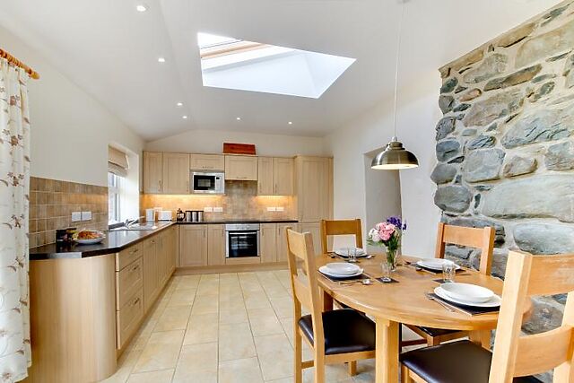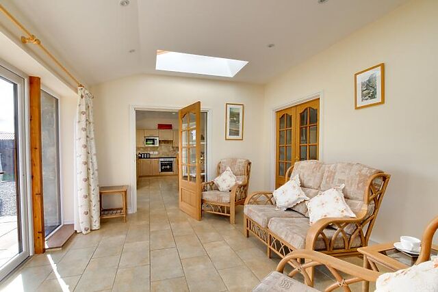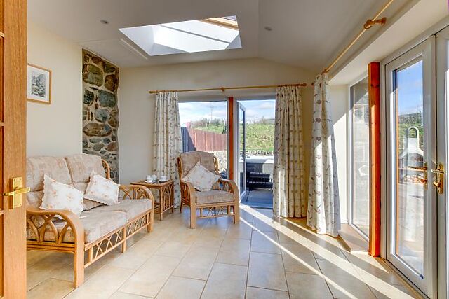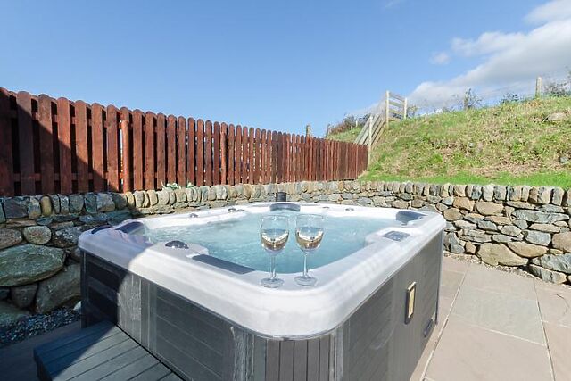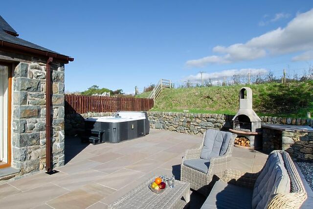 The cottage boasts an enclosed garden with a private patio, hot tub, outdoor furniture, and a BBQ/log burner, perfect for relaxing evenings. The garden also features a lawned area and an orchard, providing ample space for outdoor activities.