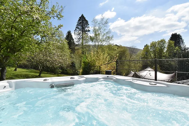 Indulge in the pleasure of a sumptuous jacuzzi cottage experience, unwinding in the hot tub with picturesque garden views.
