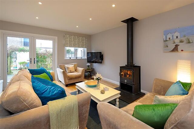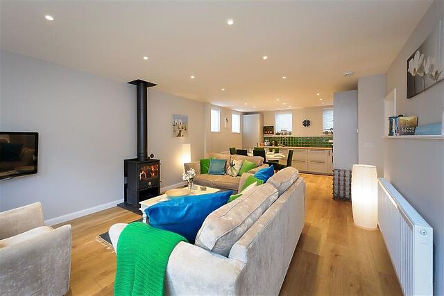 WiFi included ground floor - beautifully styled lounge area with 3 sumptuous coordinating sofas set around a feature multi-fuel burner, flatscreen TV and coffee table, shelves stocked with books, patio doors leading to the front entrance. dining area with pretty painted extending white table and contrasting chairs with green covers.