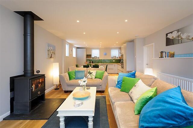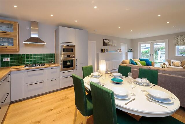 The dining area comfortably seats 7 guests and the fully-fitted kitchen is a great place for a budding chef. The stylish accents of blue, greens and grey give the room a richness in style and warmth in all seasons.