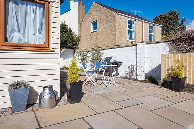 - contemporary grey kitchen with soft close drawers and cupboards, large integrated gas hob with extractor over, integrated oven and grill, integrated dishwasher & washing machine, integrated fridge/freezer, well equipped and well stocked with crockery and cutlery. - ground floor double bedroom with painted double bed and coordinating wardrobe and bed side tables with drawers, ottoman seat with storage, windows looking over side patio - in vogue shower/wet room with grey and cream tiles, shower set behind glass, wash hand basin, WC, lit mirror and heated towel rail stairs leading to first floor - elegant rear king size bedroom with divan king bed, pretty bed side tables, hanging space, occasional chair and stool with storage - stylish twin bedroom with 2 single divan beds, coordinating wardrobes and chest of drawers, bed side table, storage unit and stool with storage - front single bedroom with low painted single bed, bed side table and drawers, low level chest of drawers, occasional chair, hanging space and a front window with a glimpse of the sea towards St Tudwal's Island - front luxury bath and shower room with roll top bath with tap and shower attachment, double shower cubicle with rain shower, wash hand basin, WC and heated towel rail, please note that there are two steps leading to the bath and WC outside well-kept patio lies to the side of Lluesta Cottage with barbecue, outdoor dining table and chairs.