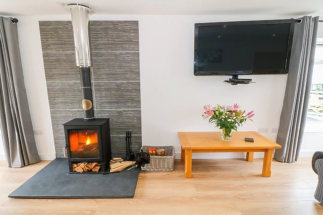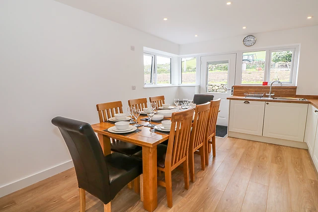 Leave your coats, boots and bags in the spacious hallway and enter this brightly-decorated property. The spacious sitting room houses a delightful woodburning stove to ensure you stay warm and toasty during your stay, with 3 large leather sofas so you can curl up with your loved ones after a long day and catch up on your favourite shows of an evening.