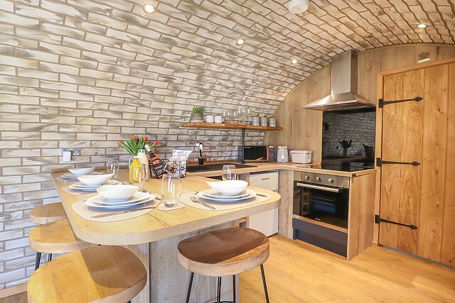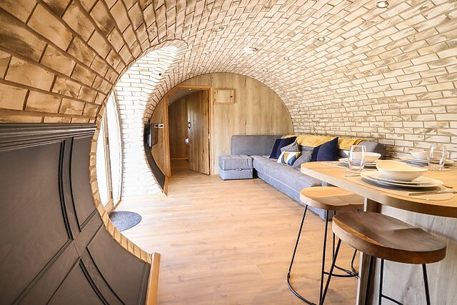 The accommodation boasts a cosy open-plan living space, complete with a modern kitchen, dining area, and a sitting area that transforms into additional sleeping quarters.