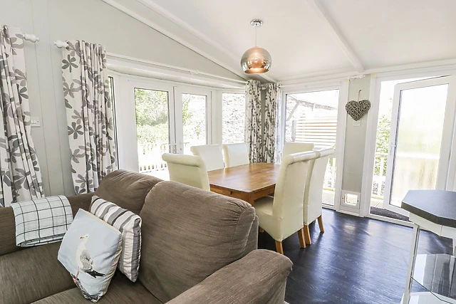 The lodge boasts a private, enclosed garden with a decked veranda, perfect for alfresco dining and soaking up the tranquil surroundings.
