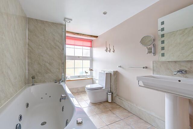 Upstairs, you'll find three en-suite king-size bedrooms, another king-size bedroom, and two double bedrooms, all featuring TVs and window seats with stunning views. The second floor houses two twin bedrooms with exposed oak beams, adding a touch of rustic charm.