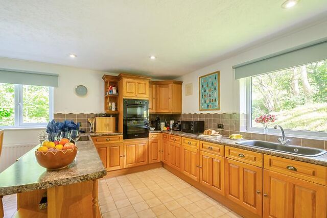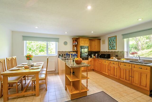 As you step inside, you'll be greeted by a warm and inviting atmosphere. The lounge features a vast stone fireplace with an open fire, perfect for relaxing evenings. The kitchen and dining area are decorated in a traditional cottage style, complete with modern appliances and stylish wooden cabinets.