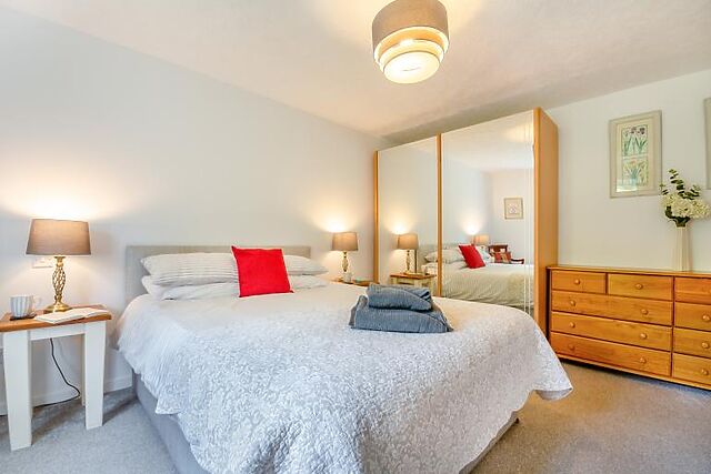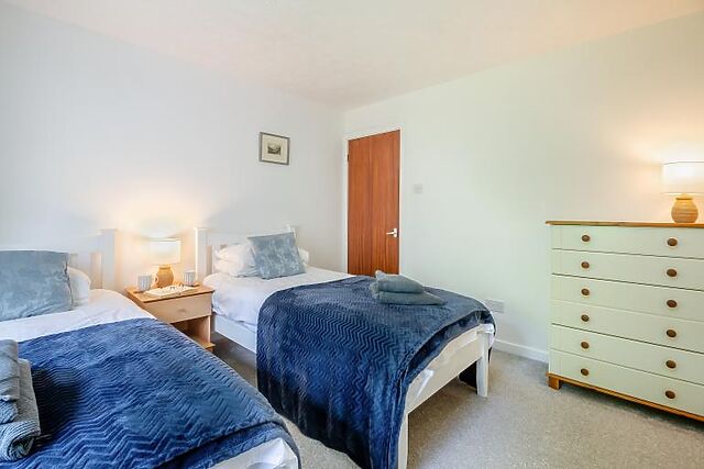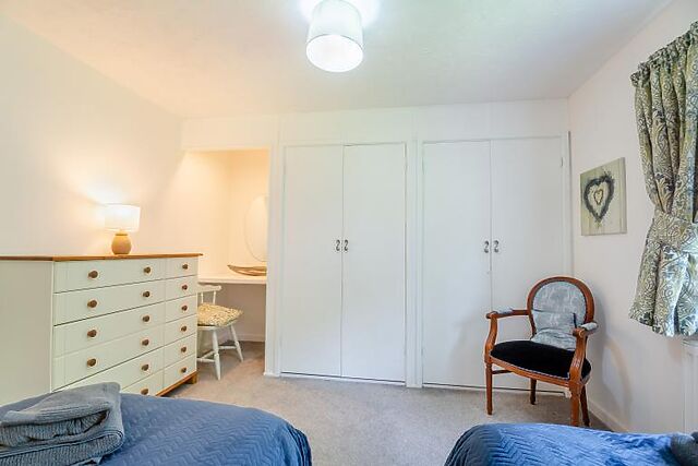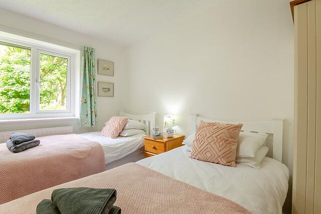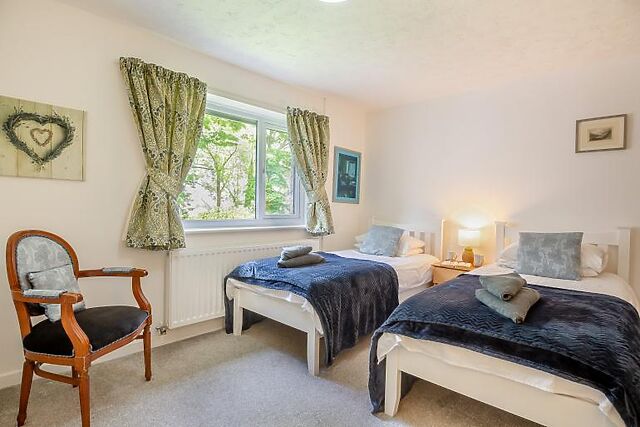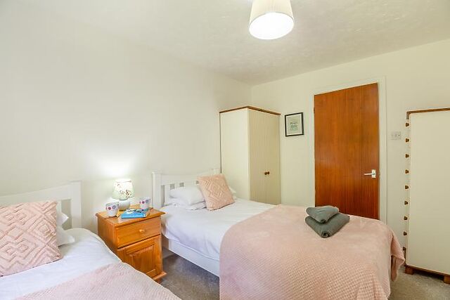 The kitchen and dining area are decorated in a traditional cottage style, complete with modern appliances and stylish wooden cabinets. The master bedroom boasts a king-size bed and an en suite, while the two twin rooms offer comfortable and minimalistic decor.