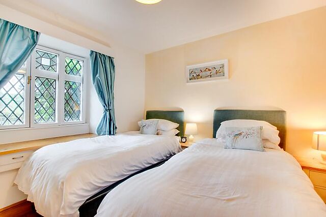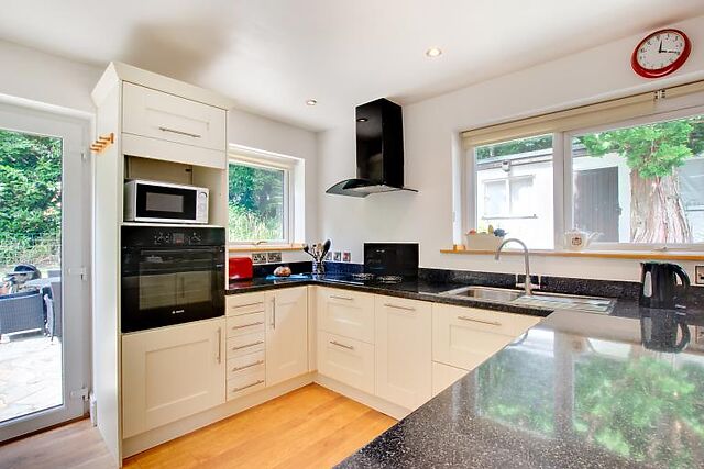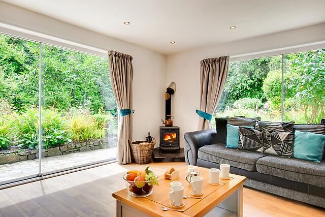 Inside, you’ll find a bright and airy kitchen with contemporary fittings and a handy breakfast bar. The lounge is inviting with a warming wood burner and comfortable seating. Sliding doors open to the outside, letting in natural light. The bedrooms include a king-size and a twin room, both with original windows.