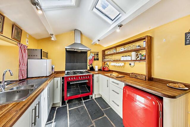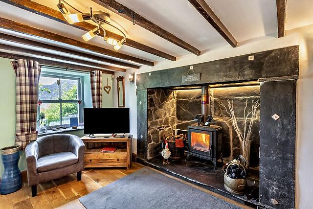 Inside, you'll find a creatively designed kitchen, a separate dining room with a wood burner, and a cosy lounge with a Smart TV and another wood burner.