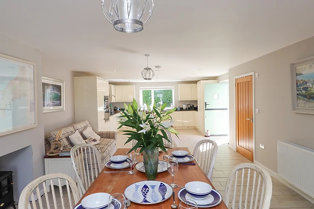 Make your way into the spacious, bright, and airy kitchen/diner which is amply appointed with everything needed to produce delicious food for the rest of the holiday party. There is even a sitting area ideal for keeping the designated chef company while cooking and when it’s time to serve up, there is an elegant dining table all set up ready for guests to take a seat and gather for sociable meals together.