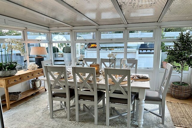 Every corner has been thoughtfully designed to capture the essence of seaside living, with light-filled spaces and a seamless blend of contemporary elegance and coastal charm. This delightful holiday home has everything you need for a perfect stay, including a fabulous outdoor area, a hot tub and outdoor kitchen with barbecue and pizza oven, and plenty of home comforts inside, including a wood-burning stove and contemporary furnishings.