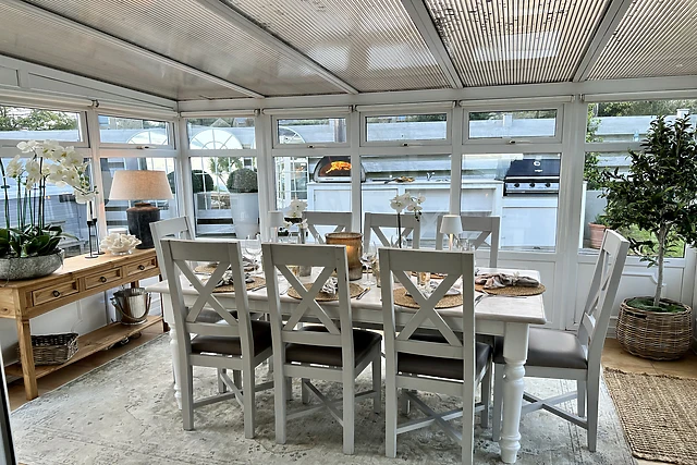 Step outside to your private oasis, where a hot tub awaits to soak away your stresses. The garden and patio area, complete with an outdoor kitchen, BBQ, and pizza oven, provide the perfect setting for al fresco dining and socialising against the backdrop of spectacular sunsets.