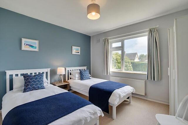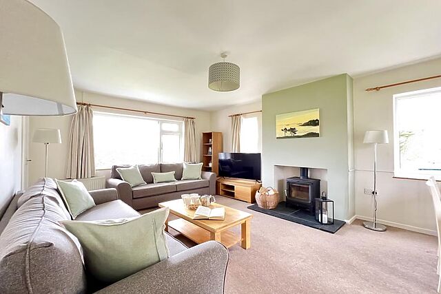 - Lounge/Dining Area: Two 3-seater sofas, cosy log burner, armchairs, coffee table, Smart TV, bookshelf, a dining table which can extend to seat 8 and French doors leading out to the garden area. - Bedroom 1: Twin bedroom with two single beds, bedside table with lamp, wardrobe and views of the garden, out towards the headland.