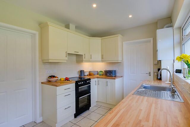 Ground Floor - Entrance Hallway: Bright and open tiled entrance hall with stairs leading to first floor and corridor leading to bathroom and downstairs bedrooms. - Kitchen: Fitted kitchen with tiled floor, electric oven and hob, dishwasher, washing machine, microwave, Nespresso coffee machine and large freestanding fridge/freezer.
