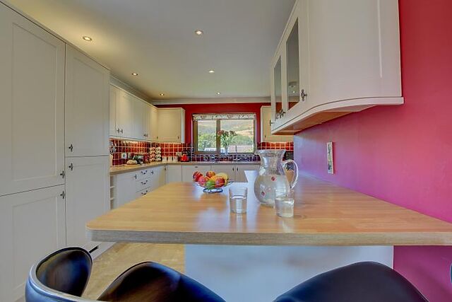 A modern, fully equipped kitchen includes an electric range double oven, fridge freezer, dishwasher, microwave, washing machine and breakfast bar. The dining table for 6 is located in a lovely corner in front of the patio doors overlooking the garden area.