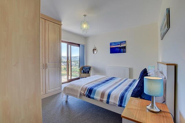 Upstairs This self catering accommodation in Snowdonia has three spacious bedrooms (two doubles and one twin) and a family bathroom upstairs. The first double room is beautifully furnished and has patio doors leading out to a south facing balcony with table and chairs to enjoy the sun all day long.