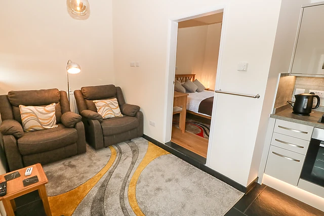 Revel in the comfort of the cosy open-plan living space, complete with a well-equipped kitchen and a quaint dining area.
