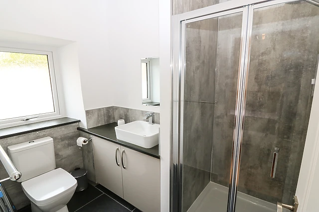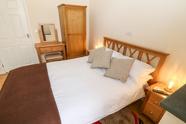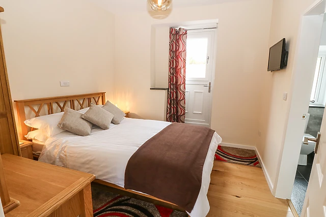 The cottage's double bedroom, adorned with a TV and an en-suite shower room, ensures a restful night's sleep.