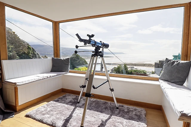 Due to the unique location of the property, vehicle access is very difficult, but luggage and shopping will be taken up to the property via quad bike on arrival between 2pm and 4pm. Stepping inside, discover the lounge, boasting a stunning fireplace with woodburning stove and an exposed stone wall feature, along with a telescope nestled in a bay window, providing an excellent space for unwinding.