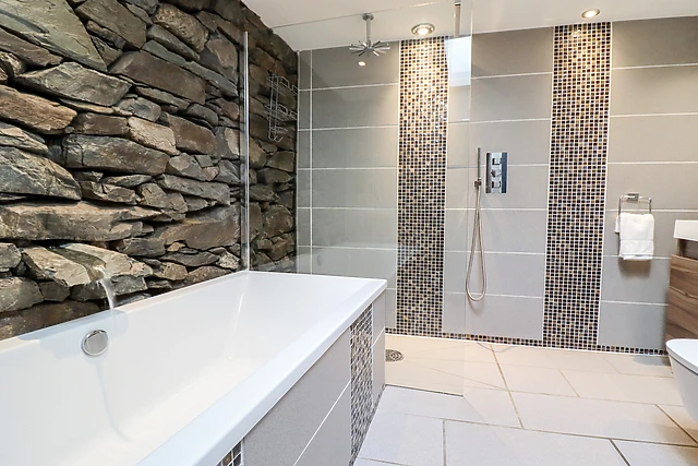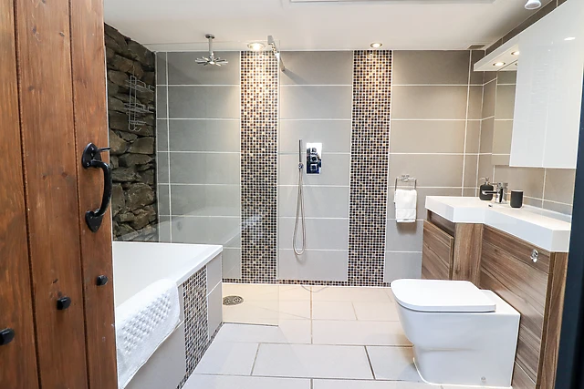 A few steps up leads into the kitchen, equipped with all the essentials for home-cooking, along with a breakfast bar with a stunning outlook over the town. Venture to the first floor and discover the stunning family bathroom, complete with a walk-in shower and bath adjacent to a natural stone feature wall, plus there is also a double and a bunk bedroom.