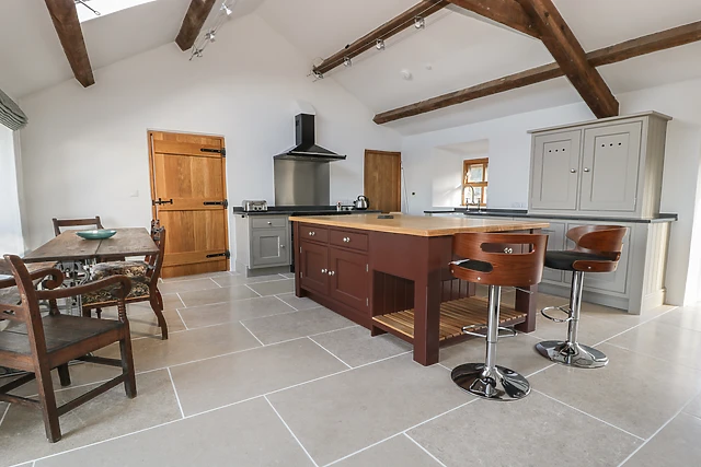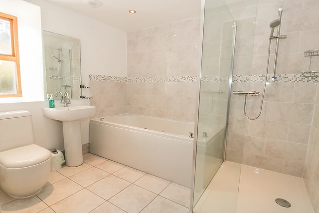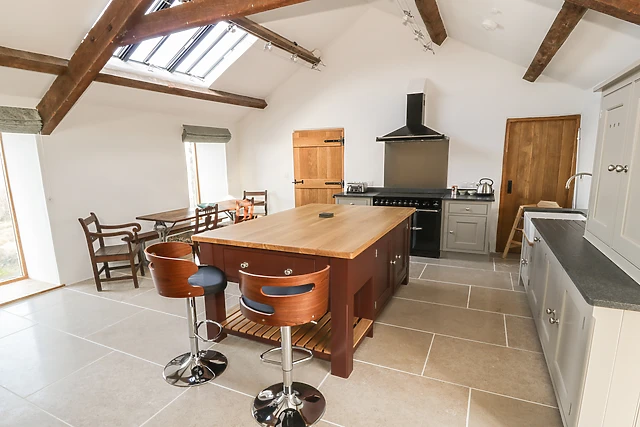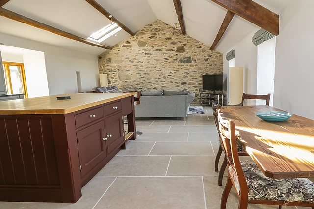 The neutral carpeted stairs lead you to the first floor, here you will find a tremendous open plan living area. This spacious room provides everything that you will need during your stay from an attractive and well-appointed kitchen to a homely sitting area with a Smart TV sat in front of the stunning feature stone wall.