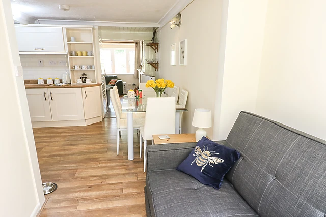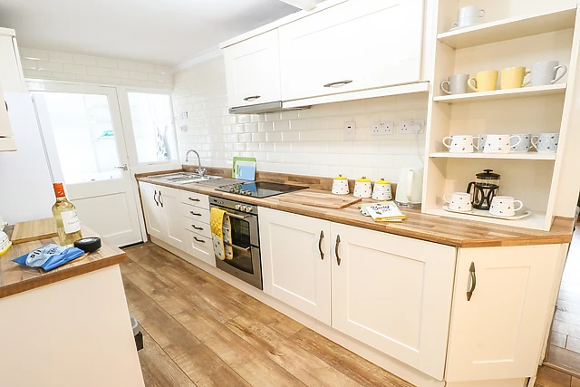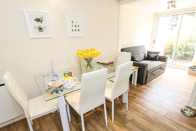 The cottage features a ground-floor bathroom and an open-plan living space that combines a well-equipped kitchen, a dining area, and a sitting area with a Smart TV.