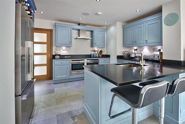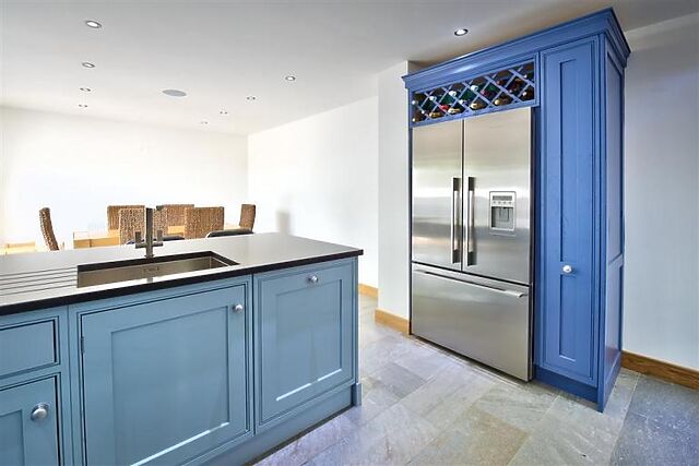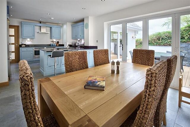 The interiors are designed to a high standard, featuring a stunning oak and glass staircase, a high-quality kitchen with granite worktops, and a living and dining room perfect for social gatherings. The master bedroom on the first floor includes an en-suite and a full-height glass apex with French doors leading to a terrace.