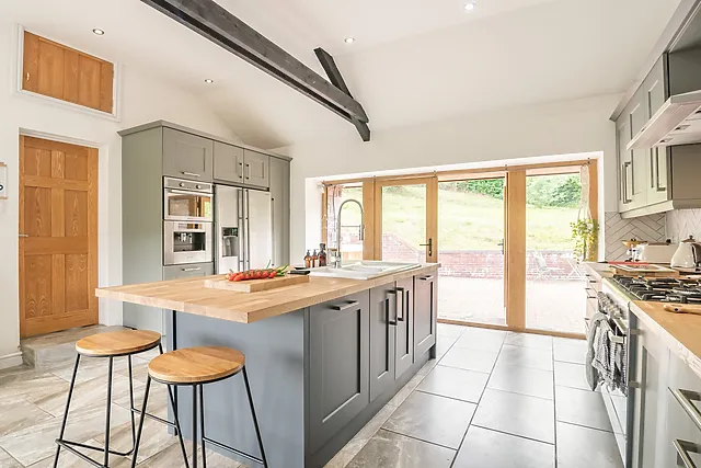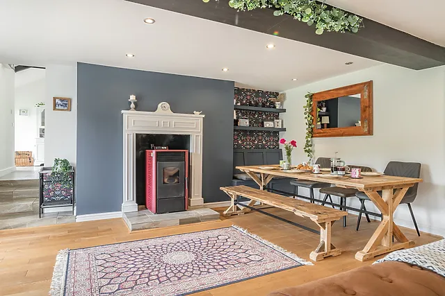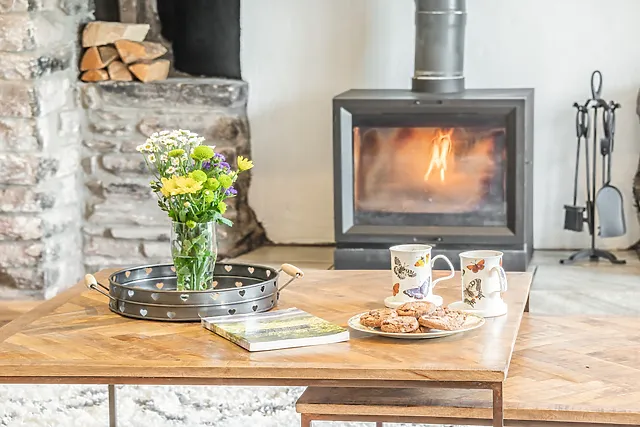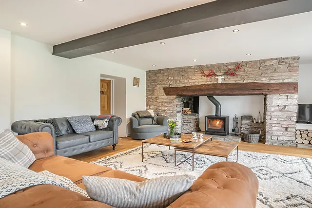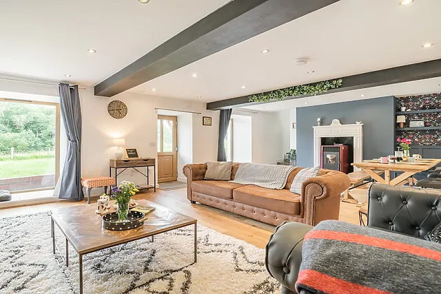 The accommodation combines rustic charm with modern amenities, including a contemporary kitchen and a cosy lounge with exposed beams and a wood burner.