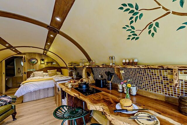 Rest and recharge - Open-plan living area with underfloor heating offers a cosy and inviting space to relax. - Bespoke fittings include a handcrafted kitchen equipped with a two-ring electric hob, microwave, and fridge.