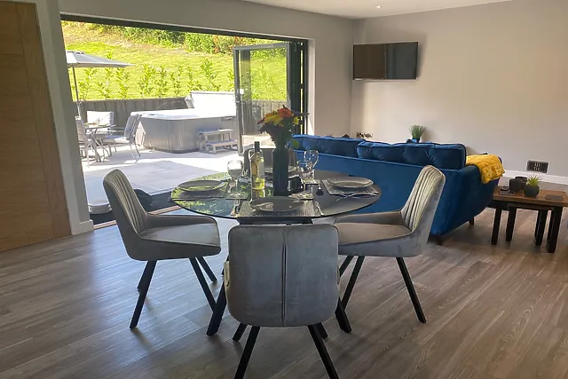 Outdoor space and on-site facilities - Private patio with bi-fold doors leading to a bubbling hot tub, offering tranquil views of the surrounding countryside. - Lawn area with a picnic bench, perfect for alfresco dining or a morning cup of coffee.