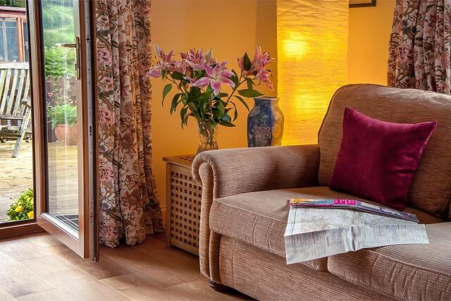 Step inside this welcoming property and into the kitchen with a compact kitchen space and dining table close at hand. The sociable lounge area features a comfortable sofa, arm chairs and a Smart TV and views across the wye valley.