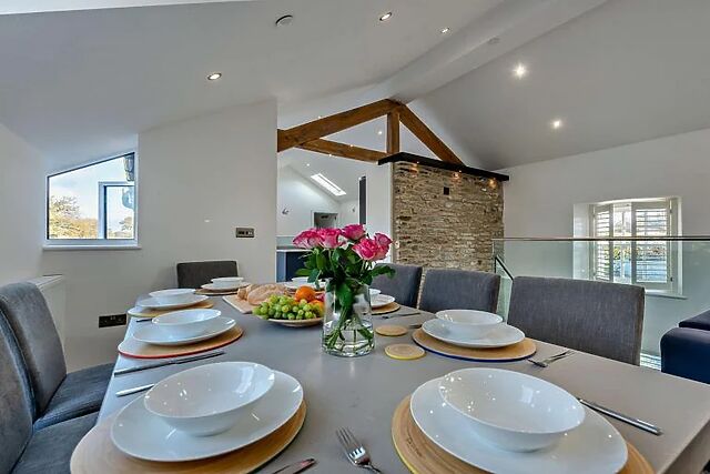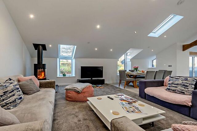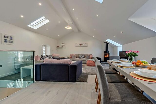 On the first floor, a large lounge, kitchen, and dining area easily blend into one another, offering all you need for endless relaxation, including a wood burner, TV, and games. Bi-fold doors lead out from here onto the patio, a large, furnished space with elevated country views.