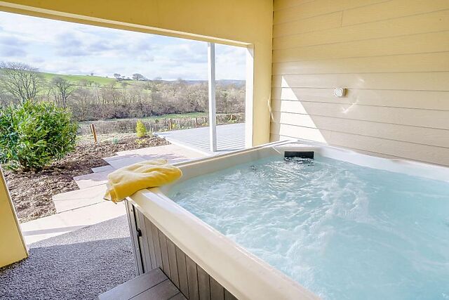 Yes, guests can enjoy the luxury of a private hot tub with a canopy, offering a relaxing experience with views of the surrounding countryside.