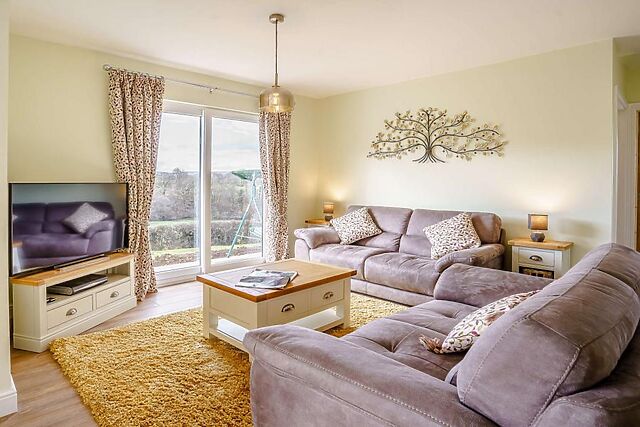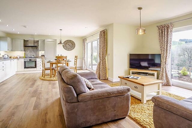 The lodge's open-plan living area, bathed in natural light, offers a cosy spot to relax after a day of exploring the Brecon Beacons.