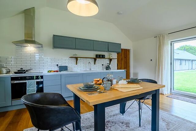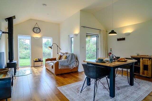 Inside, the lodge is finished to an exceptional standard, featuring a cosy open-plan living space with a wood-burning stove. The kitchen is bespoke built and well-equipped, ensuring you have everything you need for a comfortable stay.
