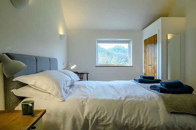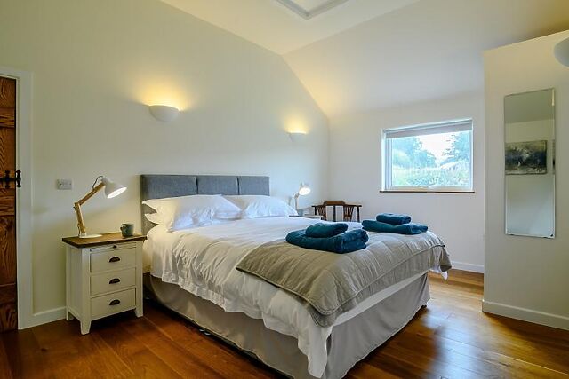 The king-size bedroom is generously sized with garden views, complemented by a luxurious shower room.