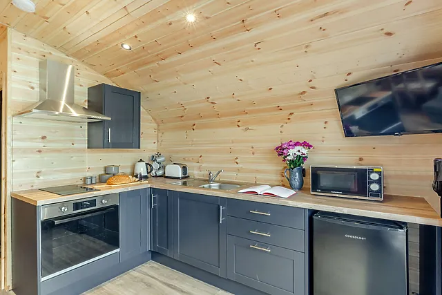 Accommodating up to 4 guests, this cosy pod features two snug bedrooms, including a king-size and a bunk room ideal for children. The open-plan living space is equipped with all the comforts of home, ensuring a relaxing stay.