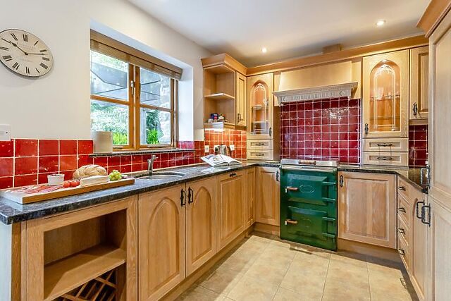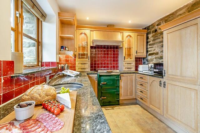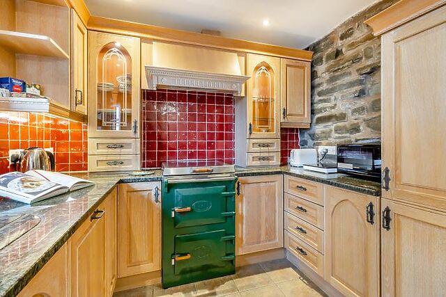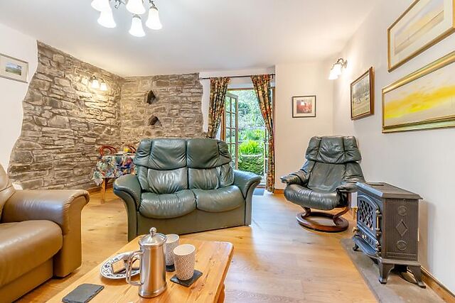 Inside, the ground floor features a well-equipped kitchen with a traditional cast iron cooker, leading to a snug living room with plush sofas and a cast iron electric fire.