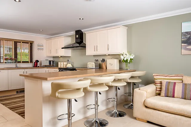 The heart of the home is a well-appointed kitchen with a large range cooker and breakfast bar, leading to a second lounge area that opens onto the patio—ideal for socialising and entertaining.