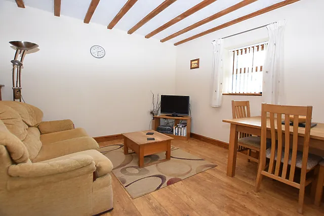 This cosy accommodation sleeps three guests in two well-appointed bedrooms, featuring traditional exposed beams and modern amenities, including smart TVs.