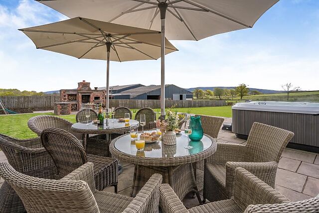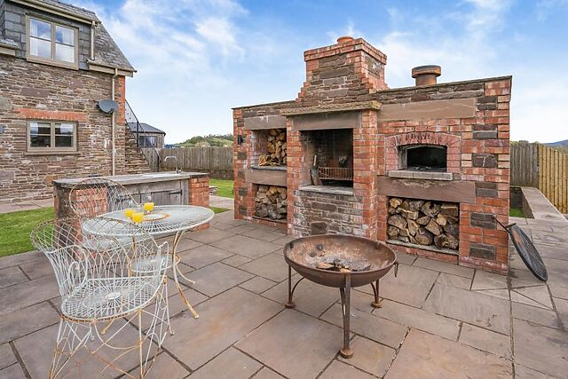 Spill outside to pamper yourselves in the hot tub or barrel sauna. Cook in the pizza oven and supervise the children on the play equipment.