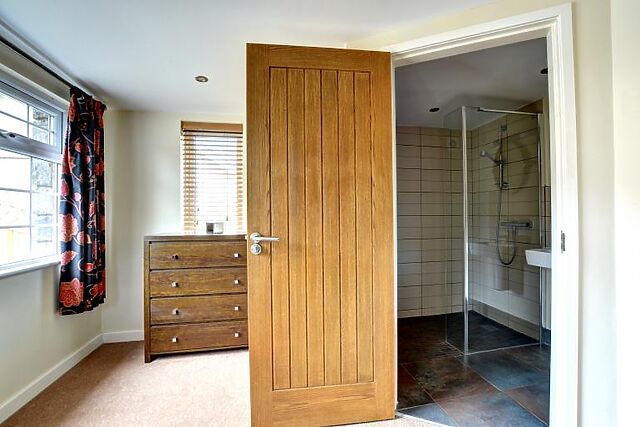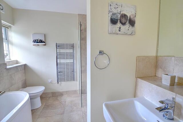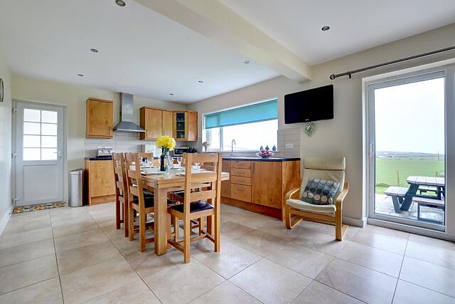 The heart of this single-storey home is its vast open-plan lounge, kitchen, and dining area. Enjoy the incredible views over the garden and surrounding countryside from the comfort of the two leather sofas. The well-equipped kitchen is perfect for preparing home-cooked meals, which you can enjoy at the dining table.