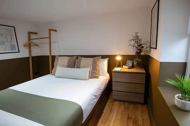 The double bedroom is styled with gentle tones and soft textures, offering a peaceful retreat after a day exploring the hills. An en-suite shower room completes the layout, with a walk-in shower, basin, heated towel rail and WC—a refreshing space to rinse off the day’s adventures before winding down.
