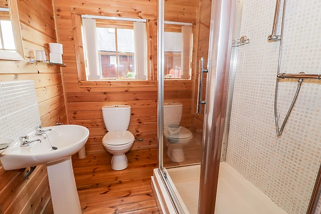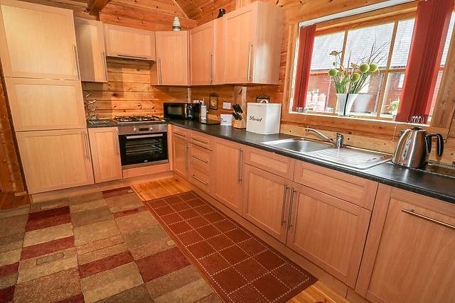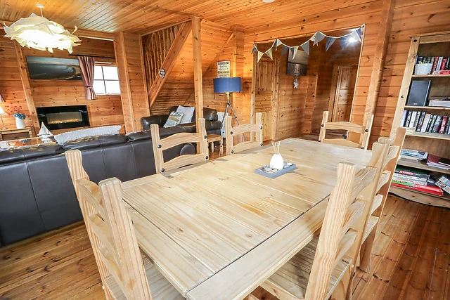 The lodge offers a delightful open-plan living space, complete with a cosy electric fire, where you can unwind after a day of exploration. The well-equipped kitchen ensures you have everything at hand to whip up a delicious meal to enjoy around the large wooden dining table.