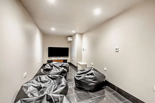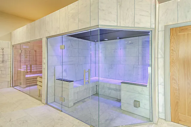 Indulge in the ultimate relaxation experience with a private spa, including a sunken indoor swim spa, sauna, steam room, and an outdoor hot tub. The spa area, adorned with Carrara marble and Italian floor tiles, offers a serene escape without leaving the comfort of your holiday home.