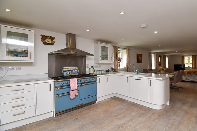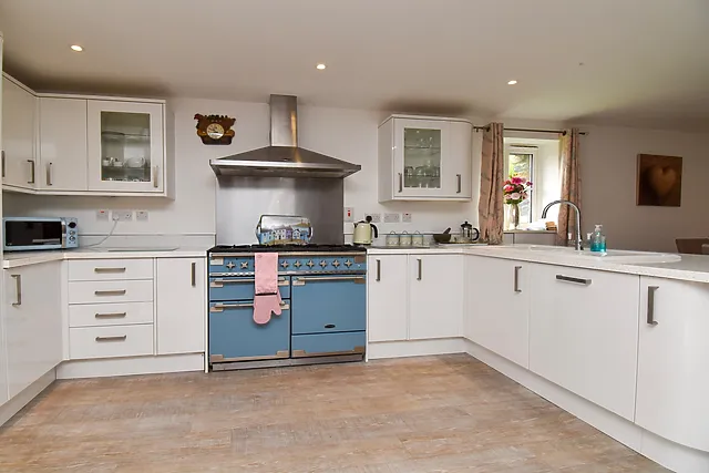 The stylish kitchen area is fully equipped with an electric range oven, gas hob, fridge, freezer, microwave, and dishwasher, catering to all your culinary needs.